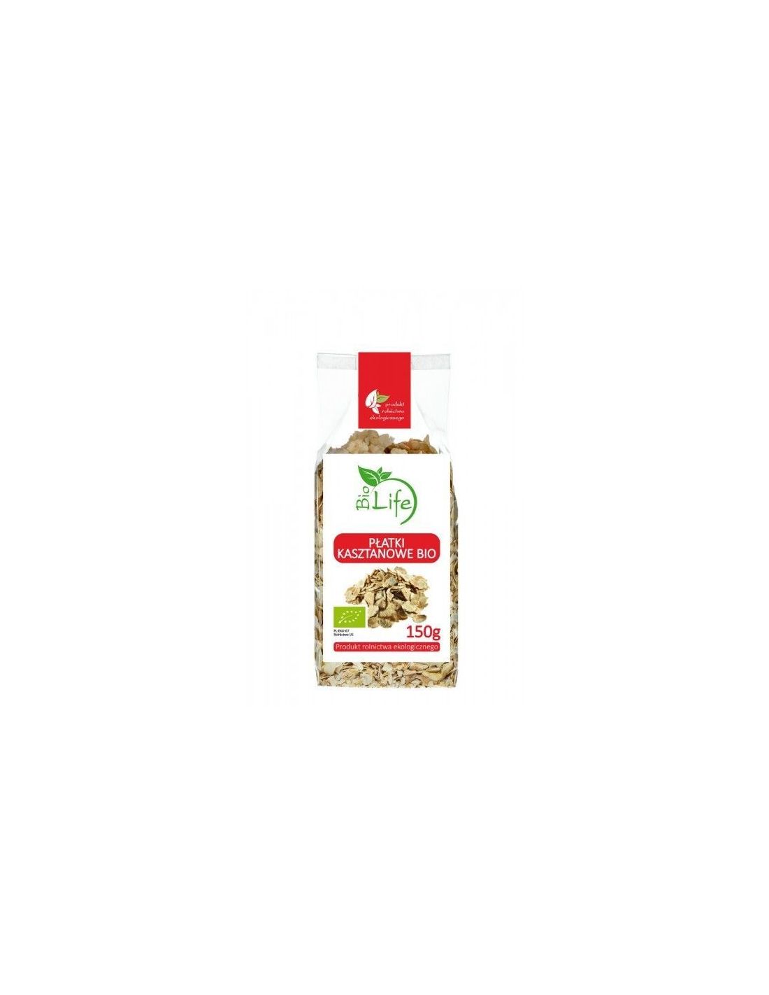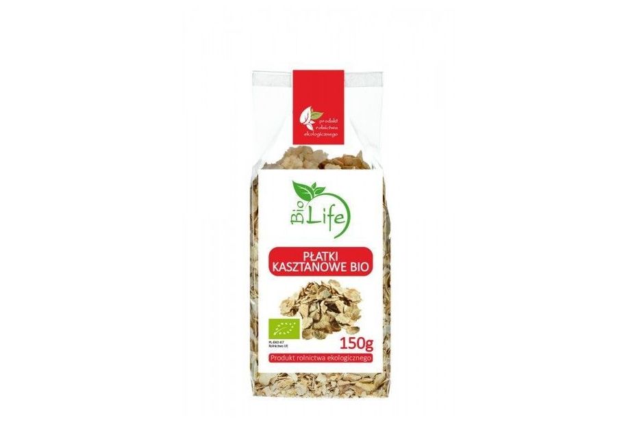 Kaštonų dribsniai BIO 150 g gaunami iš valgomųjų kaštonų vaisių. Jie yra maistinių medžiagų, vitaminų ir mineralų lobynas, turintis teigiamą poveikį viso organizmo veiklai. Kaštonų dribsniai puikiai papildo besimokančių, sportuojančių, fizinį ar protinį darbą dirbančių žmonių racioną. Be to, juose nėra glitimo ir organizmas juos lengvai pasisavina. Naudojimas: Kaštonų dribsniai puikiai tinka kaip savarankiškas patiekalas, gali sėkmingai pakeisti kenksmingus traškučius ir saldumynus.